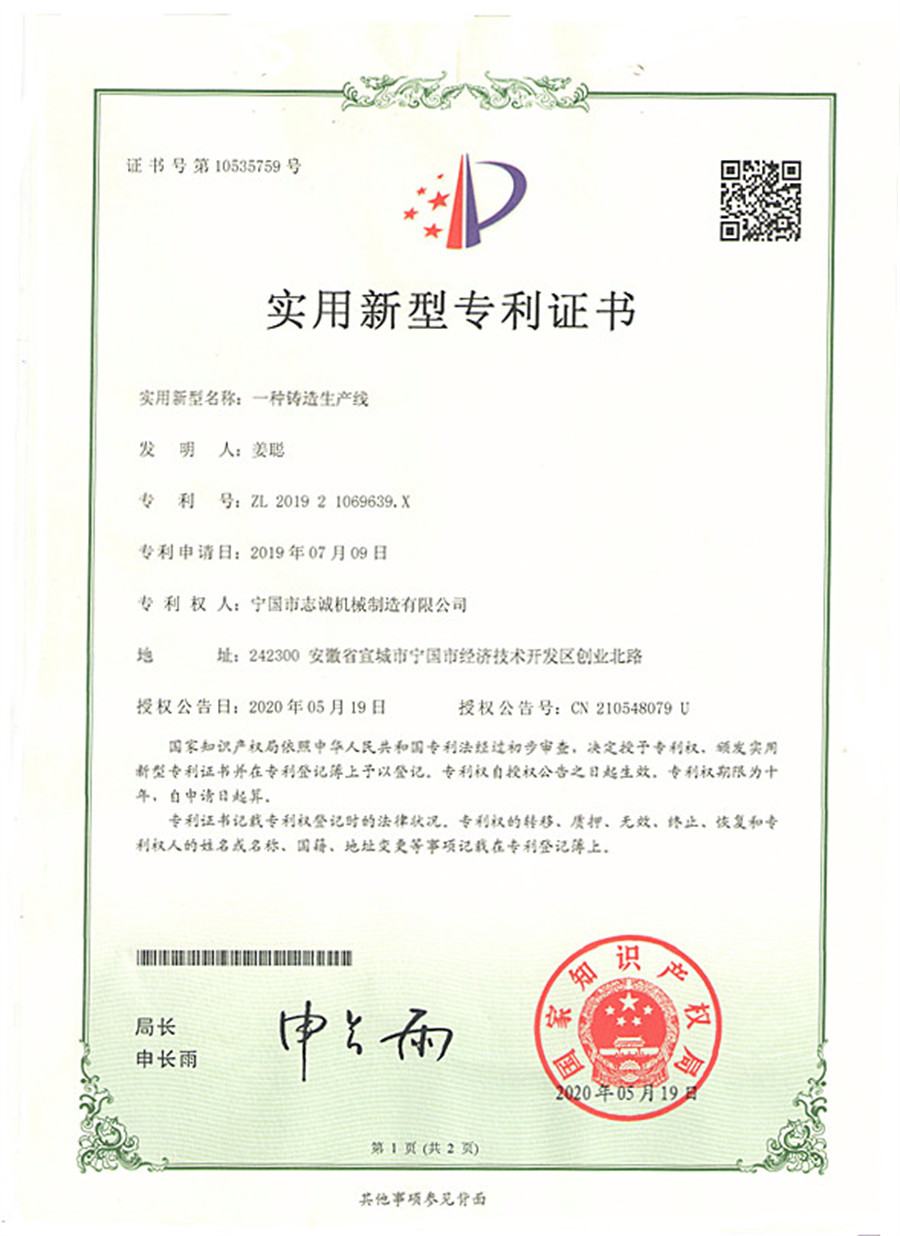 寧國市志誠機械制造有限公司位于安徽省寧國經濟技術開發區創業北路,成立于2008年5月,占地50000平米,是一家集鑄造自動化設備、熱處理自動化設備、鑄造模具研發、制造于一體的民營科技企業。2009年公司加入中國鑄造協會耐磨鑄件分會,被耐磨鑄件分會指定為“耐磨鑄件生產設備研發基地”。公司專業從事鐵模覆砂自動化鑄造生產線、熱處理自動化生產線、澆注機、鑄造模具、環保除塵及煙氣凈化設備的研發、生產與銷售.